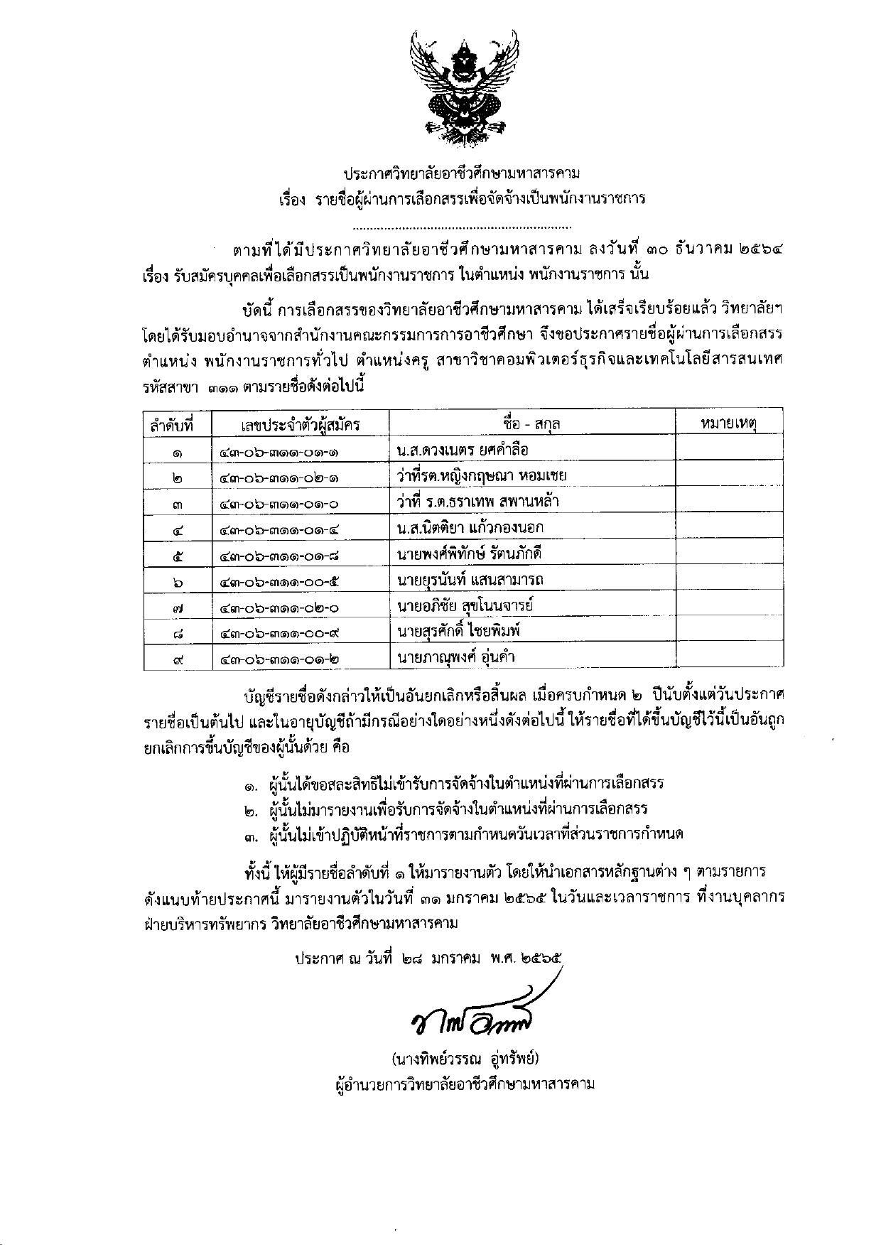 ประกาศรายชื่อผู้ผ่านการเลือกสรรเพื่อจัดจ้างเป็นพนักงานราชการ