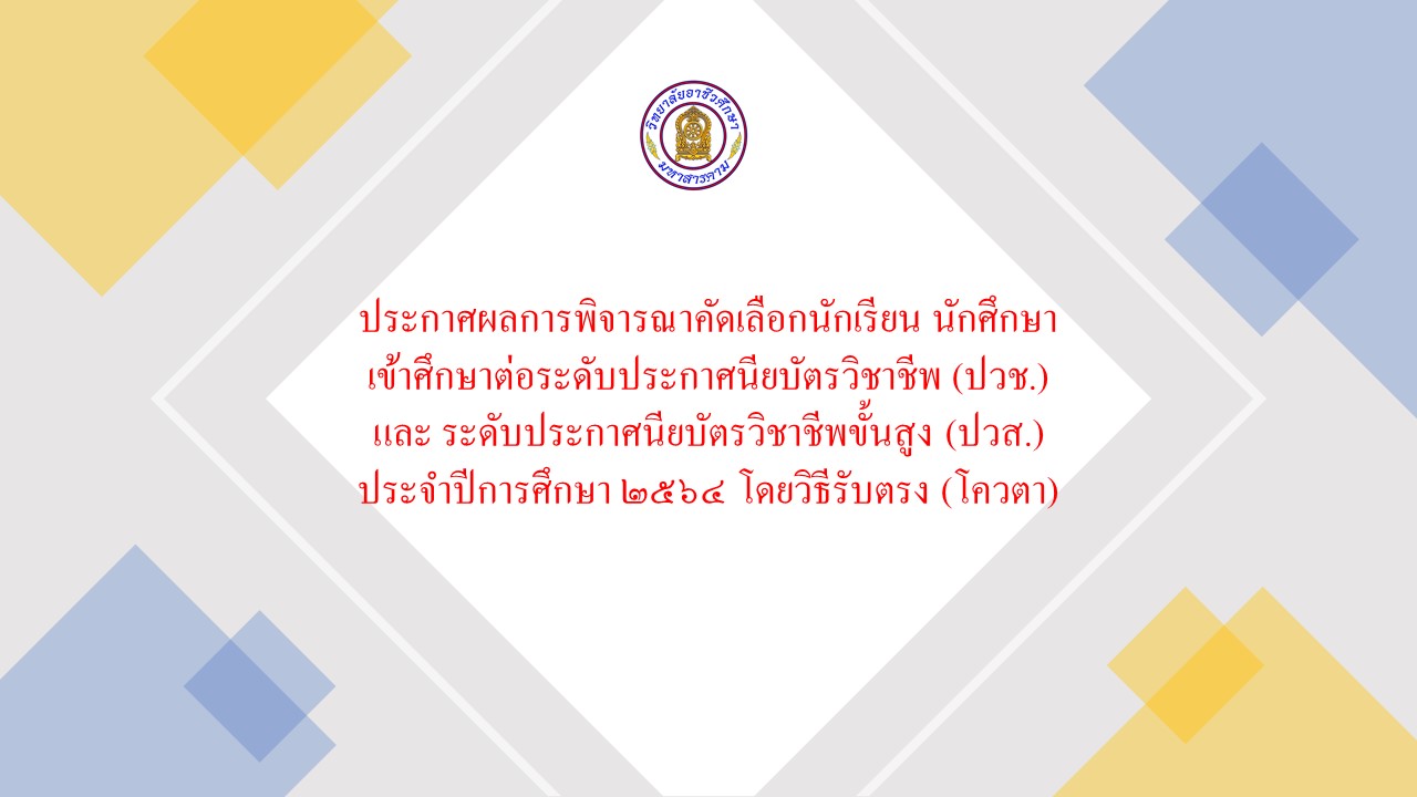 ประกาศผลการพิจารณาคัดเลือกนักเรียน นักศึกษา เข้าศึกษาต่อระดับประกาศนียบัตรวิชาชีพ (ปวช.) และ ระดับประกาศนียบัตรวิชาชีพขั้นสูง (ปวส.) ประจำปีการศึกษา ๒๕๖๔ โดยวิธีรับตรง (โควตา) 18/01/256401/03/2021Chanon Authaisomข่าวประกาศ, ข่าวสารกิจกรรม รายละเอียดเพิ่มเติม กำหนดการเเละรายละเอียดเพิ่มเติมในการเข้ารายงานตัว รายชื่อผู้ผ่านคัดเลือกนักเรียน นักศึกษา ระดับ ปวช. รายชื่อผู้ผ่านคัดเลือกนักเรียน นักศึกษา ระดับ ปวส.