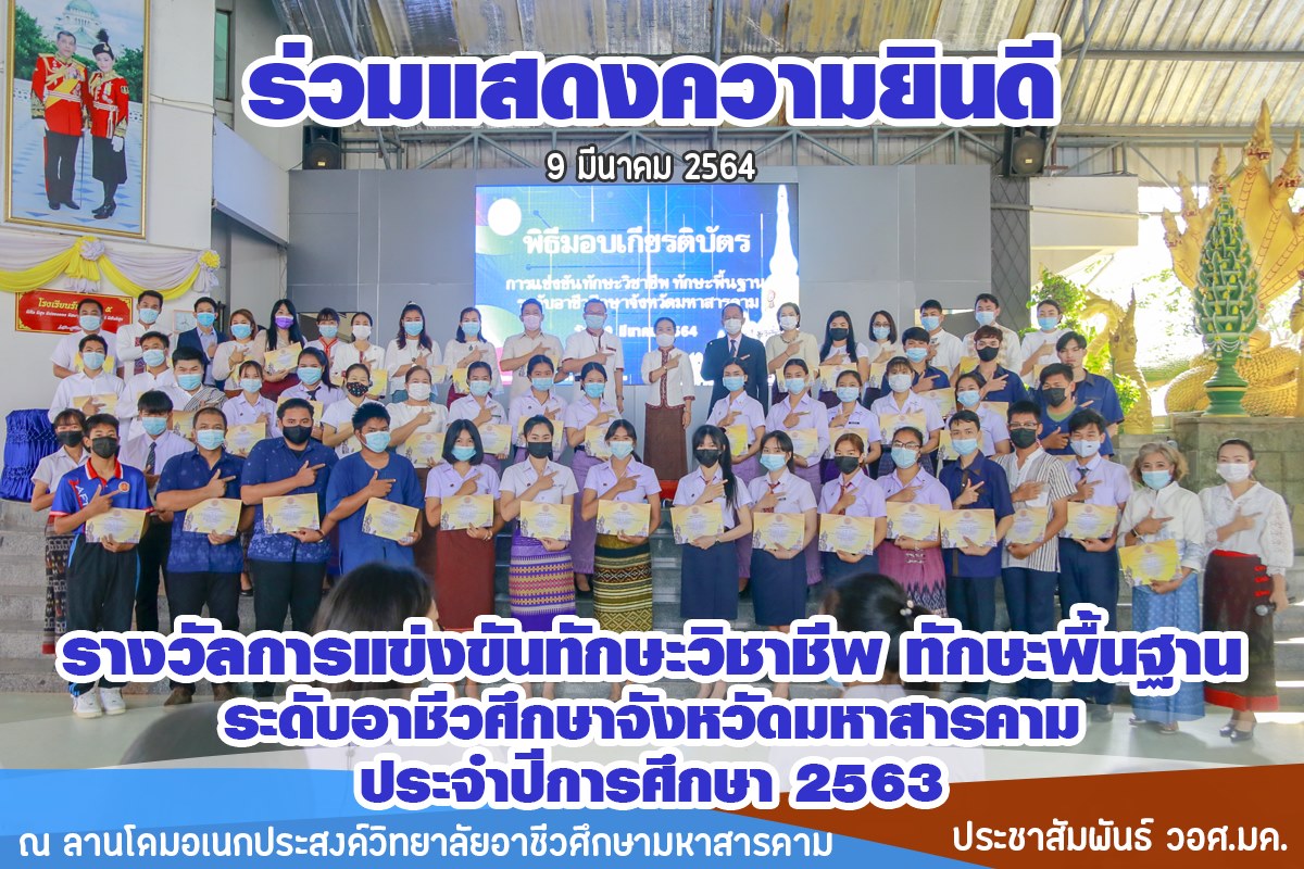 นางทิพย์วรรณ อู่ทรัพย์ ผู้อำนวยการวิทยาลัยอาชีวศึกษามหาสารคาม คณะผู้บริหาร คณาจารย์ ร่วมแสดงความยินดี พร้อมกล่าวชื่นชมตัวแทนนักเรียน นักศึกษาและอาจารย์ผู้ควบคุมทักษะวิชาชีพ ทักษะพื้นฐาน ที่สร้างผลงานในการเข้าร่วมแข่งขันทักษะ ทักษะพื้นฐานระดับอาชีวศึกษาจังหวัด ประจำปีการศึกษา ๒๕๖๓ ณ ลานโดมอเนกประสงค์วิทยาลัยอาชีวศึกษามหาสารคาม